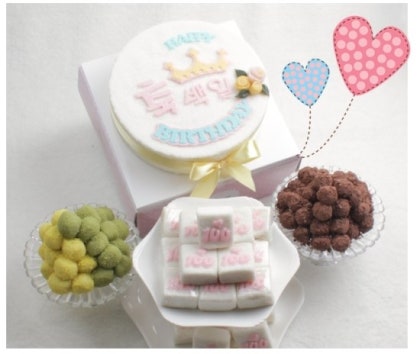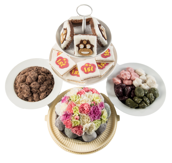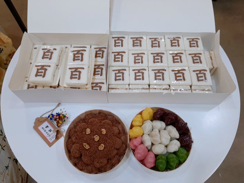 백설기: 천진난만하게 맑고 거룩함, 백설기처럼 깨끗하고 작은 병도 없이 자라라는 뜻이고, 또 백설기 100자로 100세까지 살라는 뜻도 있대요!