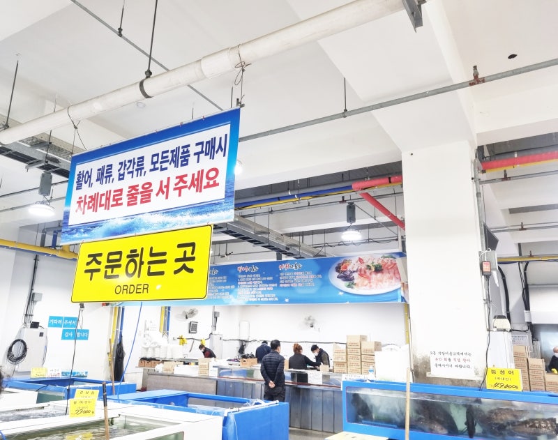 수산물도매시장중에회도건져주는곳이있어서테이크아웃주문이많았다!대게를구입해서찌는동안30분걸려안을일주욱구경